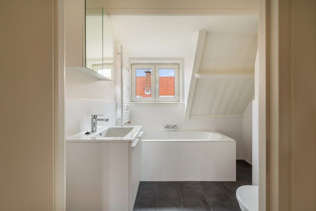 De hoofdbadkamer is uitgerust met een bad, toilet, wastafel en een praktische opbergruimte voor al uw verzorgingsproducten.