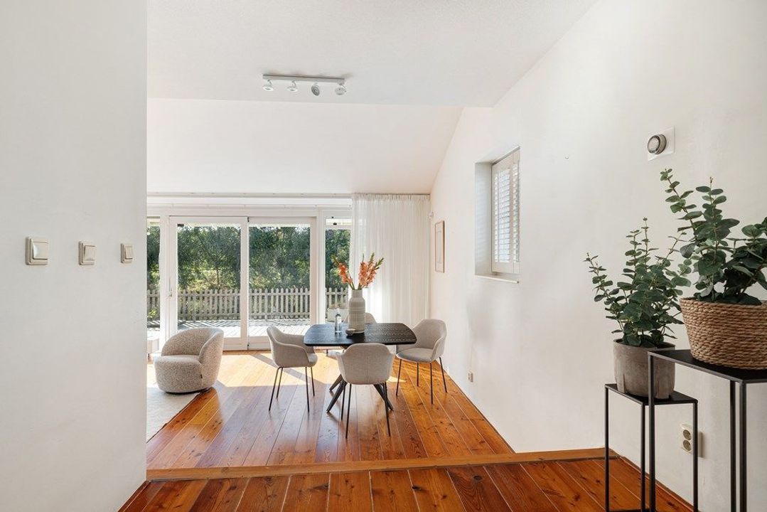 Located in a quiet, green, and child-friendly street, this bright and spacious corner house offers four bedrooms, two bathrooms, a generous kitchen-diner, and a sunny terrace directly on the water. The home is offered fully furnished, including a large dining table, corner sofa, two stylish armchairs, microwave, washing machine, dryer, additional refrigerator, and a fold-out double bed in bedroom 2.