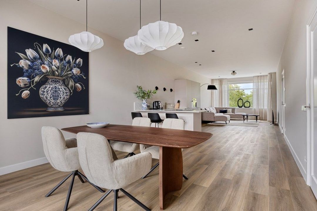 De royale, L-vormige keuken is een echte eyecatcher. Deze is uitgevoerd in een stijlvolle beige kleur en voorzien van alle gewenste apparatuur, waaronder een inductiekookplaat, combi-oven, koelkast, aparte vriezer, vaatwasser en veel praktische opbergruimte. Aan het barretje met drie barkrukken is het heerlijk ontbijten of natafelen met vrienden. Via de open indeling loop je door naar de eethoek aan de achterzijde, waar een eettafel met vier stoelen staat. Vanuit hier heb je toegang tot het balkon, een fijne plek voor je ochtendkoffie of een ontspannen lunch in de zon.